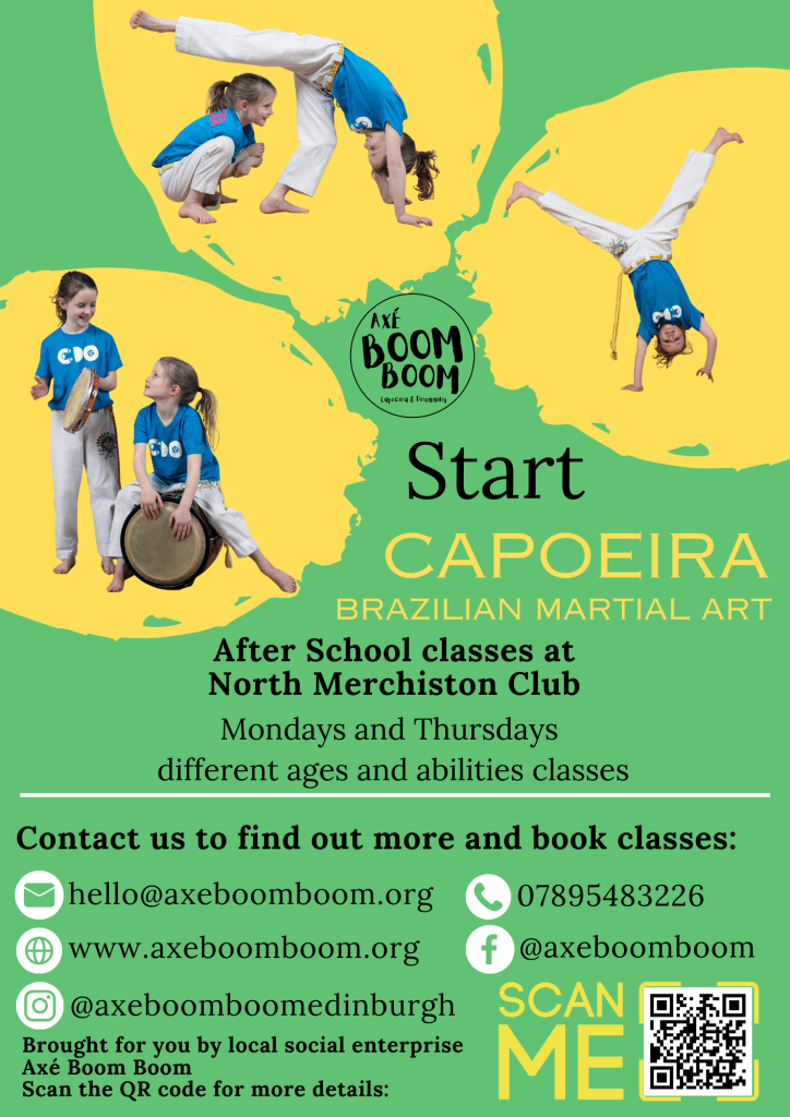 We’re all having a well deserved summer break however can’t wait to restart our Capoeira classes. No need to wait for long as we’re back at the end of August with classes at North Merchiston Club, then in September we restart Breakfast club classes at James Gillespie’s Primary School and we have a brand new class starting in Stockbridge at The LifeCare Centre. Hooray!!!