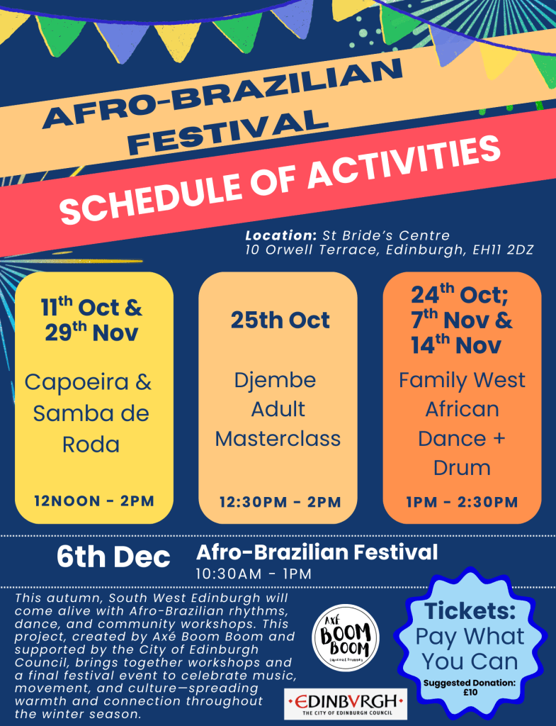 Running from October to December in South West Edinburgh, the Afro-Brazilian Festival brings rhythm, warmth, and community spirit to the winter months. This project, created, managed, and organised by Axé Boom Boom and supported by the City of Edinburgh Council, offers a series of hands-on workshops in Capoeira, Brazilian and West African dances, and Djembe drumming, giving participants of all ages the chance to learn new skills, connect with others, and immerse themselves in Afro-Brazilian culture.